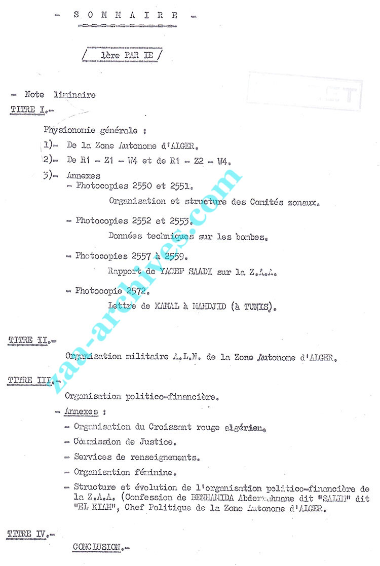 Apres l’arrestation de Yacef et de sa collaboratrice Zohra Drif, c’est Ali la Pointe dit Si Lahbib qui d’autorité à pris le commandement de la ZAA (le document 2918-2919 en fait fois). S’adressant à Safi, responsable militaire de la ZAA, ou plutôt croyant s’adresser à lui en fait il s’adresser au service du GRE.