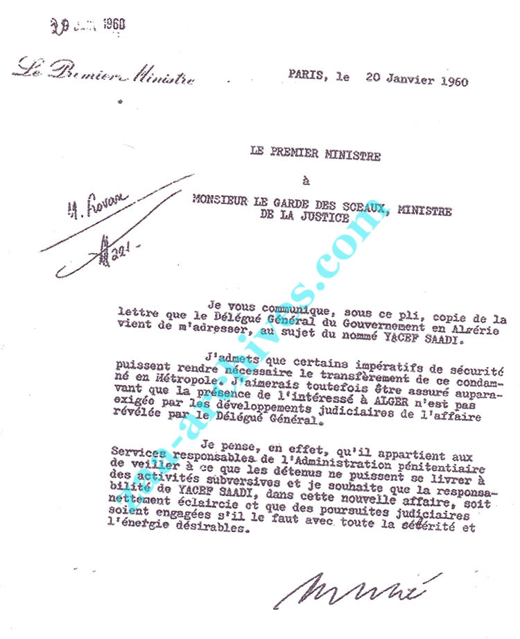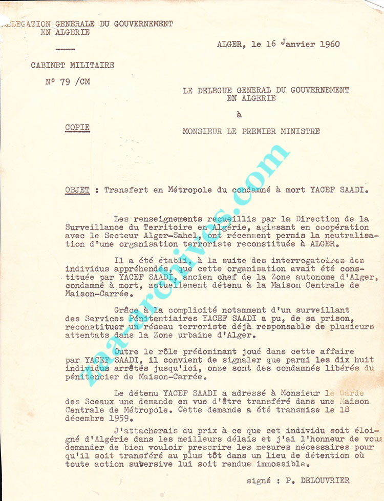 Demande émanant du Délégué Général Du Gouvernement en Algérie adressée au Premier Ministre en France lui exprimant l'urgence de transférer le prisonnier Yacef Saadi vers la métropole pour l’éloigné du nouveau réseau qui l a reconstitué en prison et qui à permis une reprise des attentats à Alger