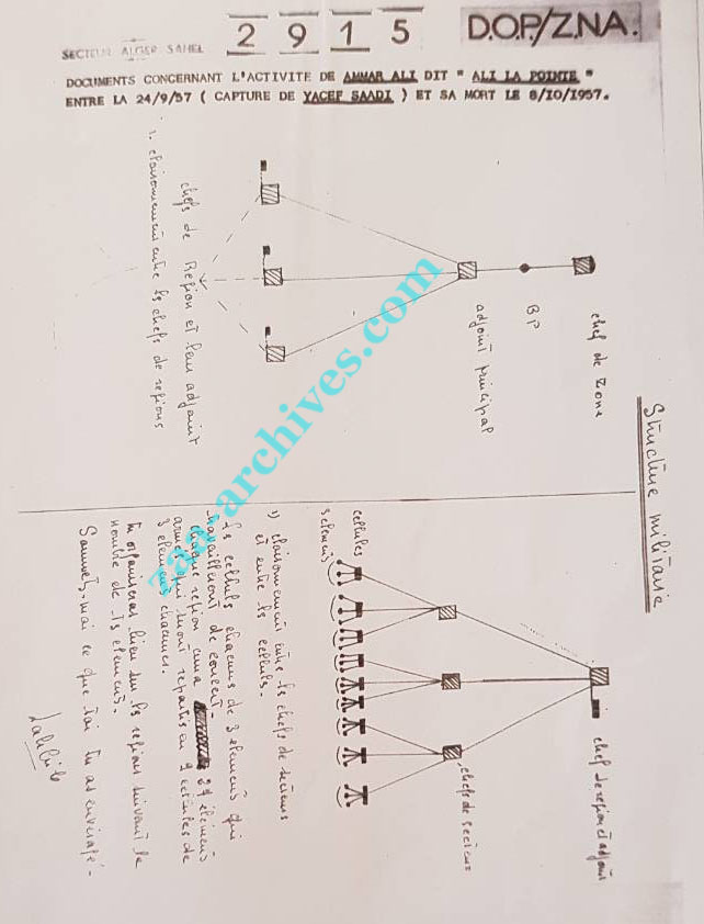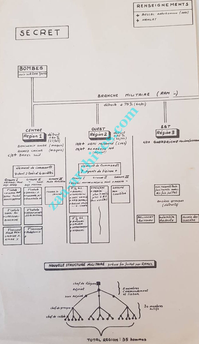 Dépendant directement du conseil de la ZAA, en été 1956 le réseau « bombes » vit le jour au sein de la branche militaire, compris au départ des scientifiques reconvertis en chimistes, dont Abderrahmane Taleb et des militants, venus des CDL (Combattants de la libération), Debih Cherif, Habib Redha, Sid Ali Haffaf, Hamid Doukanef, Boualem « Tapioca » Giorgio, Daniel Timsit et Abdelaziz Bensadok, et quatre équipes : de la carcasserie, des artificiers, du transport et des poseurs. Le transport et la pose des bombes se firent notamment grâce au concours de femmes, Djaouher Akrour, Hassiba Ben Bouali, Djamila Bouazza, Djamila Bouhired, Zohra Drif, Baya Hocine, Djamila Boupacha, Samia Lakhdari, Danièle Minne, Annie Steiner, etc. : tantôt, pour franchir les chevaux de frise qui ceinturaient la Casbah, les voiles enveloppants du hayek algérien servaient à des dissimulations ; tantôt ce rôle était dévolu au sac de plage d'accortes minettes à l'allure européenne, déstabilisatrices de la vigilance de soldats français.